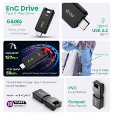 The EnC Drive 64GB is a compact, shockproof flash drive featuring a USB 3.2 Gen 1 Type-C interface, which allows for fast data transfer with a maximum read speed of 120MB/s and write speed of 50MB/s